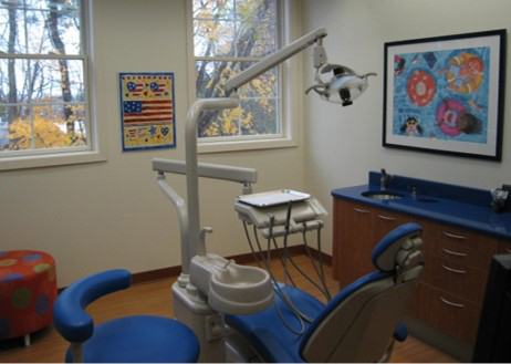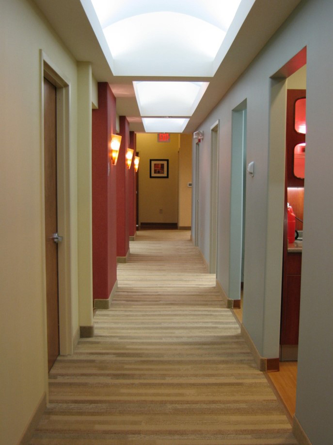 The office interior is a spa-like environment with bamboo floors, accent lighting, a comfortable adult waiting area, a brightly colored fun separate space for families, great accents and a soothing fountain in the entrance. State of the art medical equipment, massage chairs and digital technology are all incorporated in a colorful timeless palette.