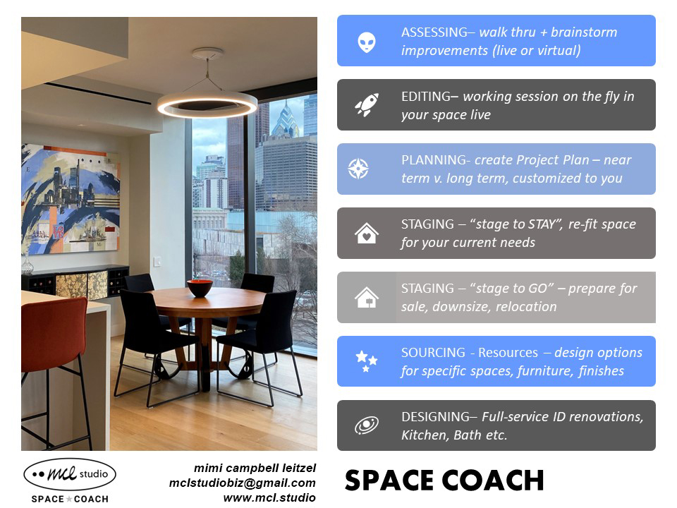 an idea that I put out there to the Universe in 2020 and in many cases, it is what I do…a lot of my work is with my Clients’ worldly belongings, art, furniture, antiques, collections, etc. and I work with existing conditions, whether in a new space or current space and act as a Space Coach merging, curating and creating design solutions.